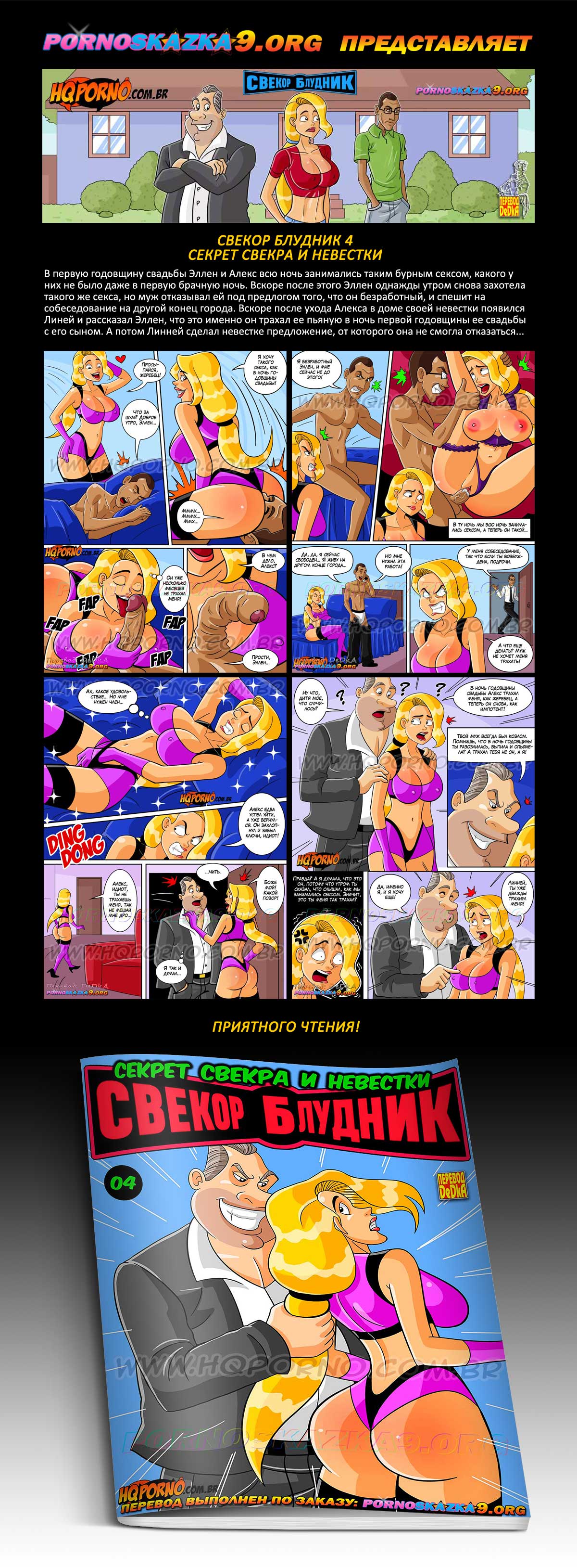 Порно комикс «Свекор блудник 4. Секрет свекра и невестки.» В первую годовщину свадьбы Эллен и Алекс всю ночь занимались таким бурным сексом, какого у них не было даже в первую брачную ночь. Вскоре после этого Эллен однажды утром снова захотела такого же секса, но муж отказывал ей под предлогом того, что он безработный, и спешит на собеседование на другой конец города. Вскоре после ухода Алекса в доме своей невестки появился Линей и рассказал Эллен, что это именно он трахал ее пьяную в ночь первой годовщины ее свадьбы с его сыном. А потом Линней сделал невестке предложение, от которого она не смогла отказаться…